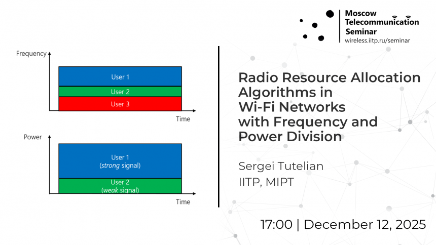 We are happy to invite you to the next talk of Moscow Telecommunication Seminar which will be held at 17.00 (MSK, UTC+03:00), on Friday, December 12, 2025. Title: Radio resource allocation algorithms in Wi‑Fi networks with frequency and power division for improving quality of service. Speaker: Sergei Tutelian, IITP, MIPT.