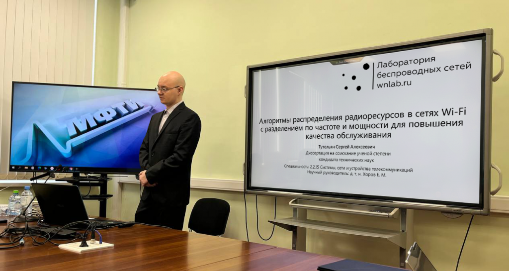 В диссертации Сергея Тутельяна «Алгоритмы распределения радиоресурсов в сетях Wi-Fi с разделением по частоте и мощности для повышения качества обслуживания» решается задача планирования радиочастотных ресурсов. В сетях Wi-Fi средняя скорость загрузки данных зависит не только от ширины полосы и мощности передатчика, но и методов множественного доступа, то есть от того, как распределять ограниченные ресурсы сети между множеством клиентских станций. Класс методов ортогонального множественного доступа, такие как OFDMA (разделение по частоте), стали стандартом управления радиоресурсами. При этом методы неортогонального множественного доступа, как NOMA (разделение по мощности), позволяют повторно использовать для передачи разных сигналов одни и те же радиоресурсы, и поэтому они более эффективны. Сергей Тутельян предложил алгоритмы управления передачами при использовании OFDMA и NOMA. Примечательно, производительность алгоритмов оценивалась с учетом реалистичных предположений, например, частотная селективность канала и обслуживание трафика Интернета вещей.